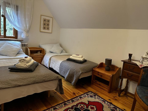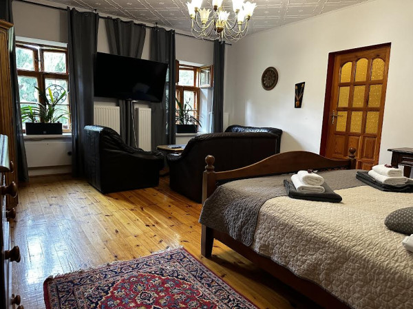 Apartament składa się z przestronnego pokoju rodzinnego, dodatkowego małego pokoiku, kuchni i łazienki. W pokoju rodzinnym znajdziemy dwuosobowe łózko sypialniane oraz wypoczynek wraz z tv. Mały pokoik wyposażony jest w dwa pojedyncze łożka. Nowoczesna łazienka z prysznicem. Kuchnia wyposażona jest w mikrofalówke i lodówkę. Apartament sąsiaduje z aneksem kuchennym na piętrze i dużym wspólnym tarasem. Ogród i bar do dyspozycji gości.